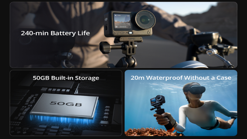 ด้านประสิทธิภาพ Osmo Action 6 มาพร้อมแบตเตอรี่ความจุ 1950mAh ที่ใช้งานได้ยาวนานถึง 4 ชั่วโมง (240 นาที) และที่น่าประทับใจคือ กล้องสามารถทำงานได้อย่างเสถียรในอุณหภูมิที่หนาวจัดถึง -20° C และไม่มีปัญหาความร้อนเกิน (Overheat) แม้ในสภาวะการทดสอบที่หนักหน่วง กล้องยังมีหน่วยความจำในตัว 50GB ทำให้ผู้ใช้ไม่ต้องกังวลว่าเมมโมรี่การ์ดเต็มกะทันหัน และมีความทนทานสูงสุดด้วยการกันน้ำได้ลึกถึง 20 เมตร โดยไม่ต้องใช้เคส พร้อมมีมาตรวัดแรงดันน้ำในตัวสำหรับการดำน้ำ