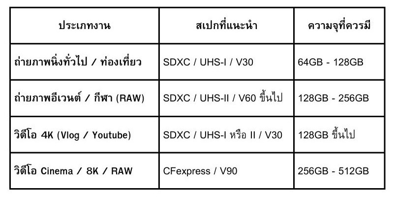 SDXC ความจุ 64GB – 2TB (เป็นมาตรฐานที่แนะนำสำหรับช่างภาพปัจจุบัน)