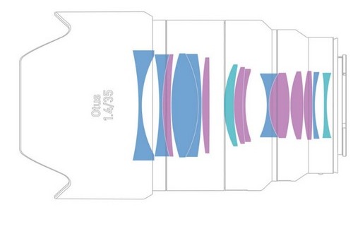 - การออกแบบเชิงแสง ใช้ดีไซน์แบบ Distagon ประกอบด้วยชิ้นเลนส์ 15 ชิ้น ใน 11 กลุ่ม