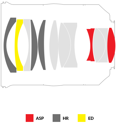 ชิ้นเลนส์พิเศษ (ASP และ HR และ ED) ด้วยการออกแบบเลนส์ 12 ชิ้นใน 10 กลุ่ม ที่เพิ่มความละเอียดและควบคุมความผิดเพี้ยนของสีต่างๆ จะได้ภาพที่ชัดเจนจากตรงกลางไปถึงขอบ ช่วยปรับให้แสงสว่างได้อย่างมีประสิทธิภาพ และนำเสนอภาพที่ดูสะอาดตาและสดใสพร้อมกับเซ็นเซอร์ และใช้เทคโนโลยีการเคลือบเลนส์หลายชั้นแบบพิเศษควบคุมflaresและghosts