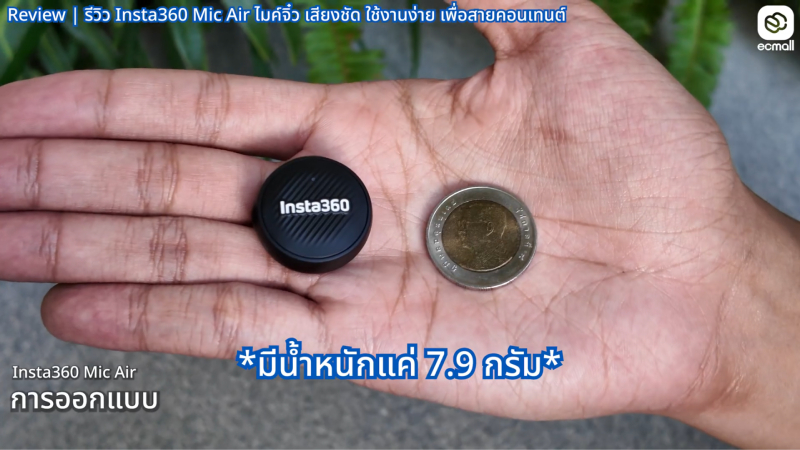 Insta360 Mic Air มีขนาดเล็กจิ๋วและน้ำหนักเบามากเพียง 7.9 กรัม ซึ่งเล็กกว่า AirTag ของ Apple ด้วยซ้ำไป การออกแบบที่เรียบง่ายและขนาดที่เล็กนี้ทำให้เมื่อติดเข้ากับเสื้อผ้าแล้วดูไม่เกะกะสายตา ทำให้ภาพที่ได้ดูเป็นธรรมชาติมากขึ้น เหมาะสำหรับคนที่ต้องการถ่ายคลิปแบบไม่เป็นทางการและไม่ต้องกังวลเรื่องอุปกรณ์ที่ดูเทอะทะ