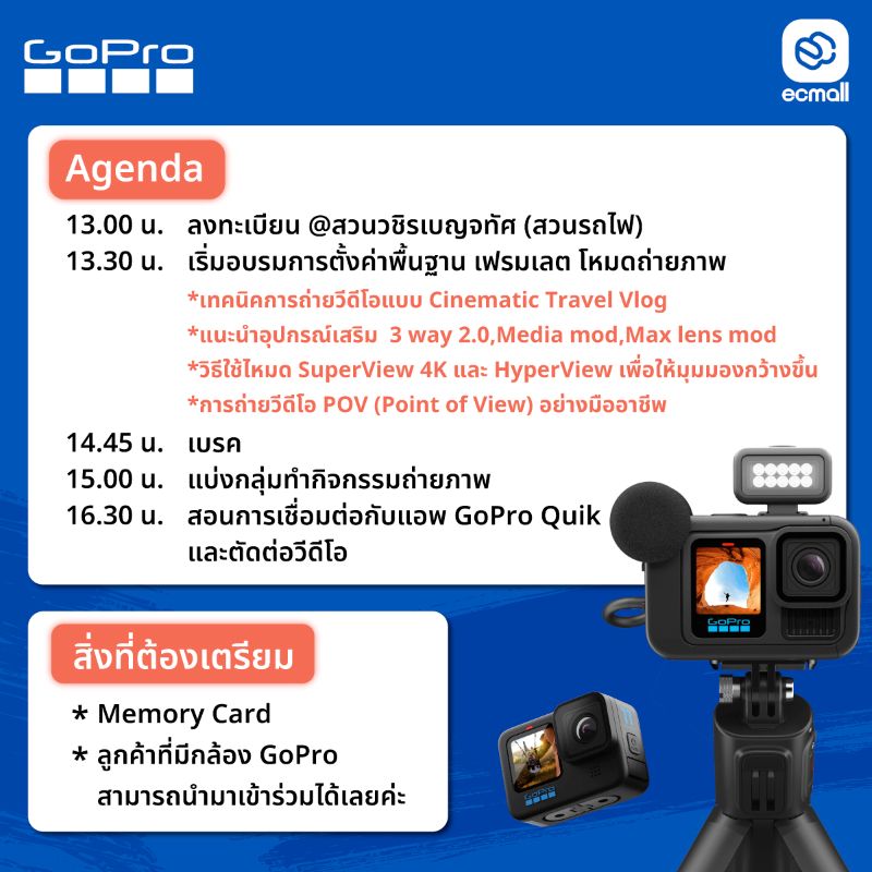 มาเรียนรู้เทคนิคการถ่ายวิดีโอให้น่าดึงดูด พร้อมเคล็ดลับการใช้ GoPro Hero 13 ให้ได้ภาพที่สวย คมชัด และมีมุมมองที่แปลกใหม่ ไม่ว่าจะเป็นมือใหม่ หรือมืออาชีพ ก็ถ่ายวิดีโอและเล่าเรื่องผ่านภาพเคลื่อนไหวแบบที่ใครเห็นก็ต้องว้าว ที่ สวนวชิรเบญจทัศ (สวนรถไฟ) ทีมงาน Gopro thailand จาก RTB มาให้ความรู้ทุกฟังก์ชั่นการใช้งาน พร้อม แนะนำ อุปกรณ์เสริม Gopro hero 13