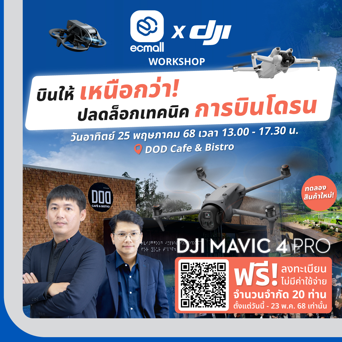 Workshop Drone First Flying By EC MALL x DJI ครั้งที่4 บินให้ เหนือกว่า ❗ ปลดล็อคเทคนิค การบินโดรน แบบ Exclusive❗กับ Product Specialist จาก DJI Experience Store Thailandพิเศษ! พร้อมให้คุณสัมผัส DJI Mavic 4 Pro โดรนเรือธงลำใหม่รุ่นล่าสุด