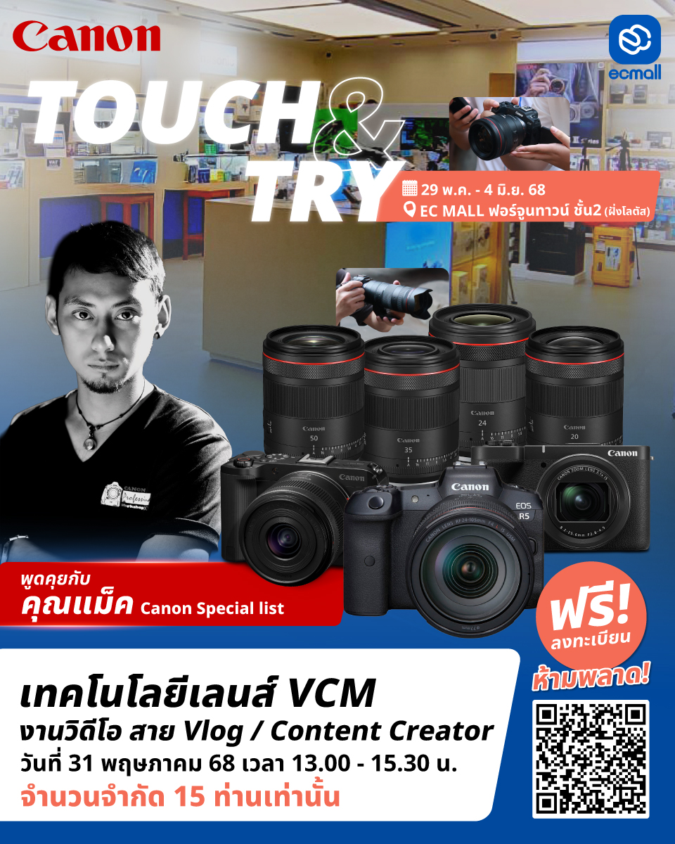 สาวก Canon สาย Vlog หรือ Content Creator ห้ามพลาด!พบกับกิจกกรม Touch & Try กล้องและเลนส์ Canon และเทคโนโลยีเลนส์ VCM พร้อมพูดคุยกับ คุณแม็ค – Canon Specialist แบบใกล้ชิดมาแชร์เทคนิคเด็ด สำหรับสาย Vlog / Content Creator บอกเลยว่าถ่ายวิดีโอเนียนกริ๊บ ลื่นไหลแบบมือโปร!
