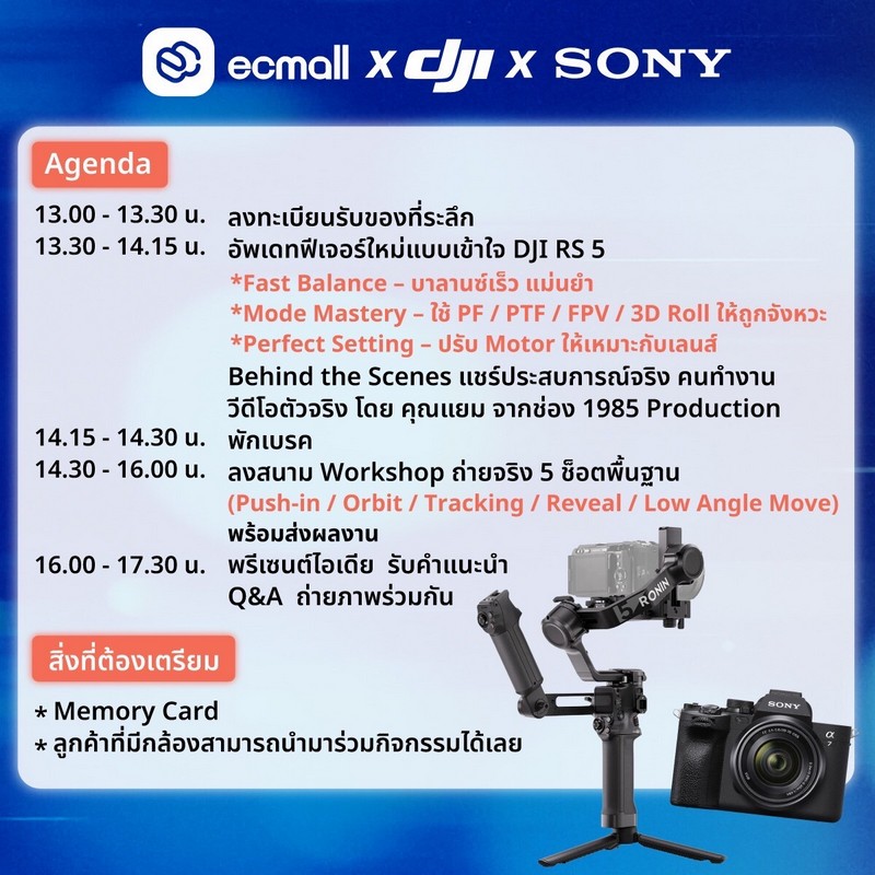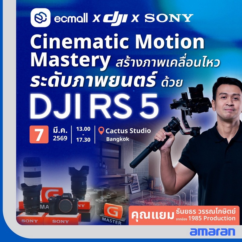 Workshop สุดพิเศษจาก EC MALL x DJI สายวิดีโอ ครีเอเตอร์ และทีมโปรดักชันห้ามพลาด! นี่คือโอกาสที่จะช่วยให้งานของคุณลื่นไหลและยกระดับคุณภาพวิดีโอให้ดู Professional ขึ้นทันทีด้วย DJI RS 5 ไม้กันสั่นอัจฉริยะรุ่นล่าสุด หากคุณเป็นคนหนึ่งที่ใช้ Gimbal อยู่แล้วแต่รู้สึกว่ายัง “ดึงศักยภาพออกมาไม่สุด” หรือกำลังอยากเริ่มต้นใช้งานให้คล่องตัวแบบมือโปร Workshop นี้จะเปลี่ยนทุกวิธีการถ่ายของคุณไปตลอดกาล!