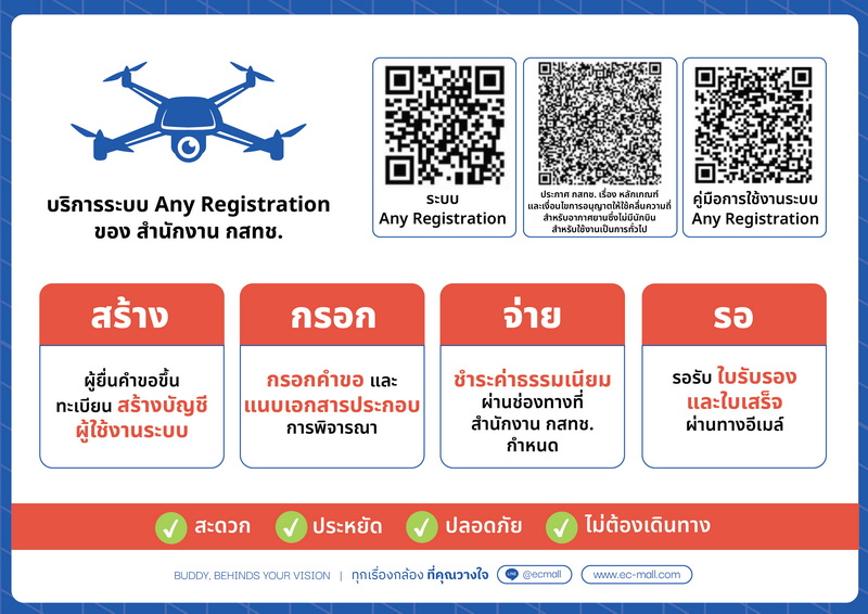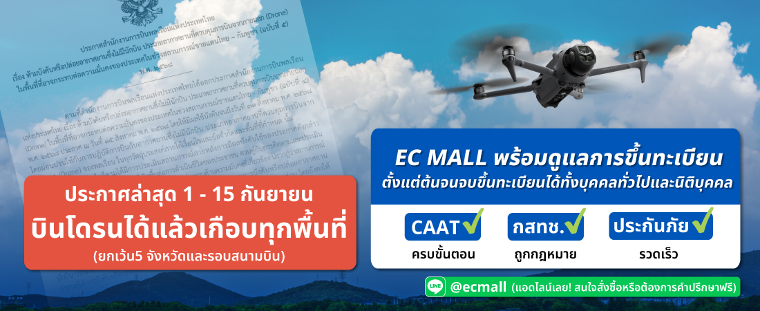 บินได้อย่างมั่นใจ กับ EC MALL ครบจบในที่เดียว บริการขึ้นทะเบียน และ ทำประกันภัย บินอย่างถูกกฎหมาย ปลอดภัย และ พร้อมใช้งานทันที