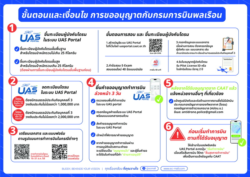 - ขึ้นทะเบียนกับ กสทช. NBTC และ CAAT ( ผ่านแอปพลิเคชั่น UAS Portol )