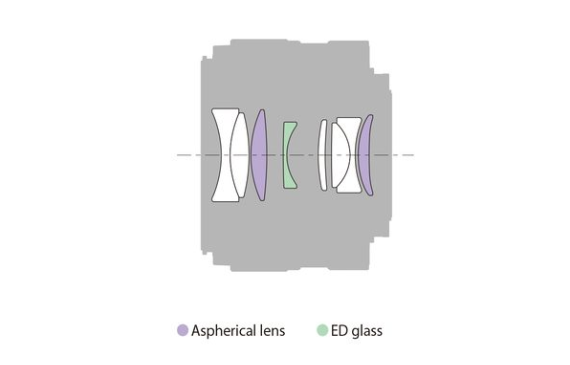 ชิ้นเลนส์ Aspheric ลดการบิดเบือน ในขณะที่ชิ้นเลนส์กระจก ED (Extra-low Dispersion) ให้ความเปรียบต่างและความละเอียดที่เหนือกว่า รวมทั้งให้สีที่ไม่ผิดเพี้ยน