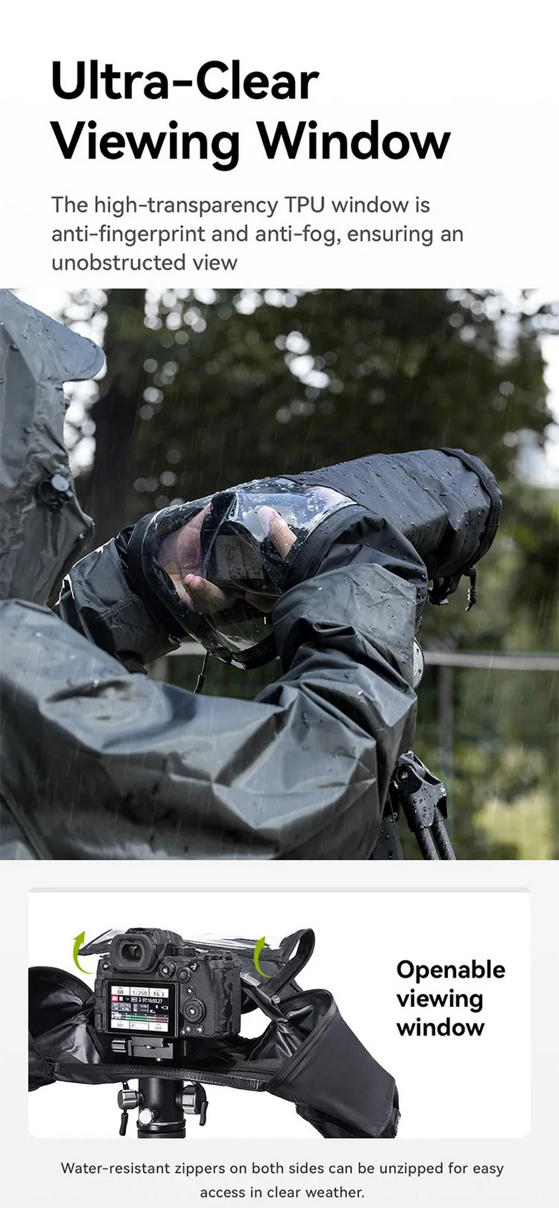 ออกแบบให้ เปิด-ปิดด้วยซิปกันน้ำคู่ (Dual Waterproof Zippers) เพื่อความรวดเร็วในการเปลี่ยนเลนส์หรือปรับตั้งกล้องโดยไม่ต้องถอดซองทั้งหมด ด้านข้างมี ปลอกแขนยืดหยุ่นทั้งสองข้าง ทำให้ผู้ใช้สามารถปรับกล้อง โฟกัส หรือซูมได้อย่างอิสระแม้ขณะฝนตกหนัก