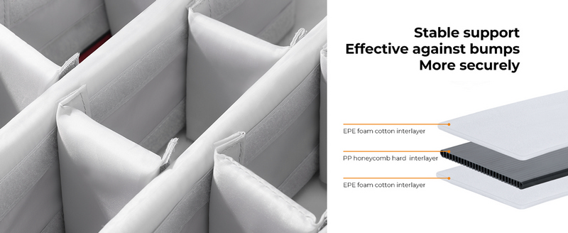 มาพร้อมตัวแบ่งช่องแบบเคลื่อนย้ายได้ (Removable Dividers) ช่วยให้คุณจัดสรรพื้นที่ตามขนาดอุปกรณ์ที่ใช้งานจริง ไม่ว่าจะเป็นเลนส์ขนาดใหญ่หรือแฟลช