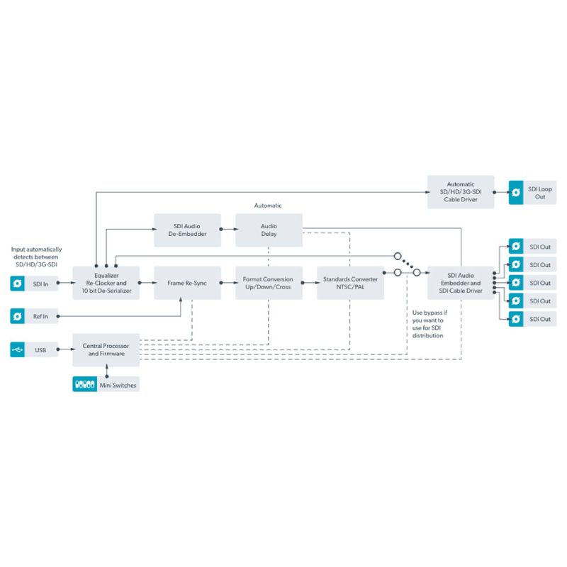 Mini Converter รองรับทั้ง SD, HD, UHD และ DCI 4K โดยตรวจจับสัญญาณวิดีโอที่เข้ามาโดยอัตโนมัติและปรับให้เหมาะสมทันที รองรับมาตรฐาน SMPTE 259M, 292M, 296M, 372M, 424M, 425M A/B และ ST-2081
