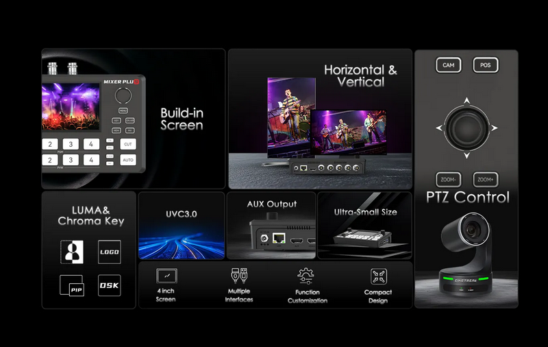 CineTreak Mixer Plus คือวิดีโอสวิตช์เชอร์ระดับมืออาชีพที่ออกแบบมาเพื่อการไลฟ์สตรีมและงานโปรดักชันแบบหลายกล้องโดยเฉพาะ ให้ความสามารถระดับสตูดิโอในตัวเครื่องขนาดกะทัดรัด เหมาะสำหรับครีเอเตอร์ สตูดิโอไลฟ์สด ทีมถ่ายทอดสด งานอีเวนต์ งานสอนออนไลน์ ไปจนถึงงานประชุมองค์กรที่ต้องการความเสถียร ความยืดหยุ่น และการควบคุมแบบเรียลไทม์