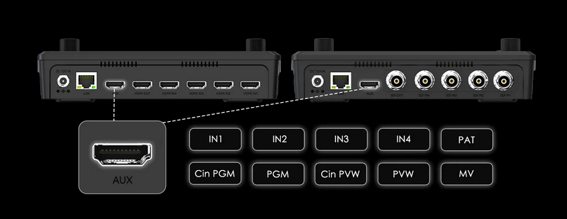 เอาต์พุต AUX HDMI ของ Mixer Plus สามารถเลือกแสดงสัญญาณได้หลากหลาย ไม่ว่าจะเป็น IN1–IN4, PGM, Clean PGM, PVW, Clean PVW, PAT หรือ Multi View ช่วยให้ผู้ใช้งานจัดการ Workflow ได้ยืดหยุ่น เช่น ใช้เป็นจอพรีวิว ส่งภาพสะอาดไปยังจอ LED หรือแยกสัญญาณให้ทีมงานหลังบ้าน