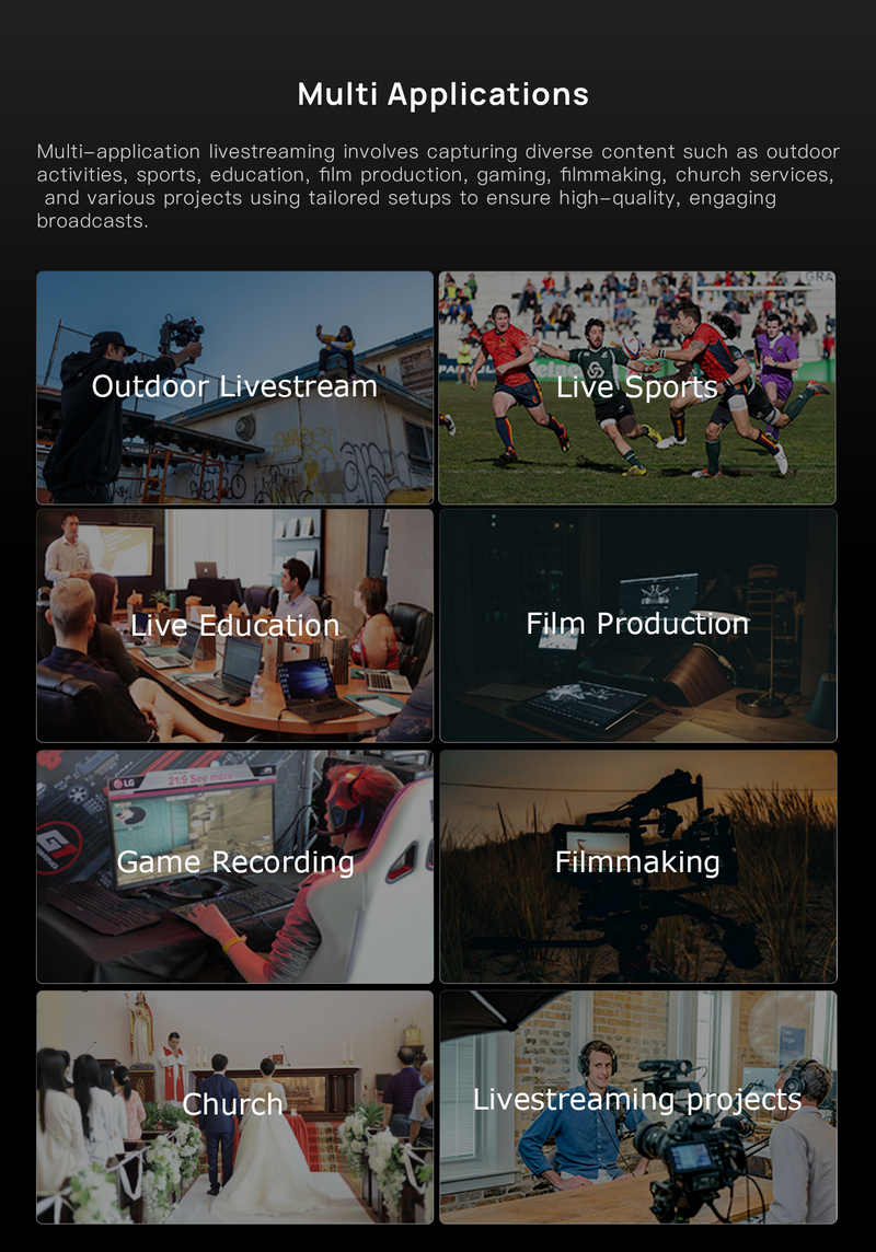 เอาต์พุต HDMI รองรับฟังก์ชัน AUX และการแสดงผลแบบหลายหน้าต่าง ช่วยให้สามารถดูพรีวิวจากทุกแชนแนลพร้อมกัน หรือเลือกดูเฉพาะสัญญาณที่ต้องการ เพิ่มความคล่องตัวในการควบคุมงานหลายกล้องและหลายแหล่งสัญญาณ