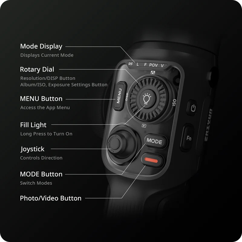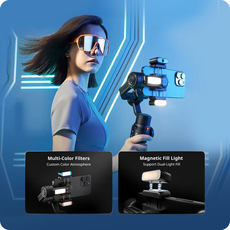 Zhiyun Smooth 5S AI มีไฟเสริม Built-in Fill Light กำลังสูง 650 Lux ที่แกน Tilt Axis และสามารถติดตั้งไฟแม่เหล็กเพิ่มเติมได้อีก 2 ดวง รวมความสว่างสูงสุดถึง 2040 Lux