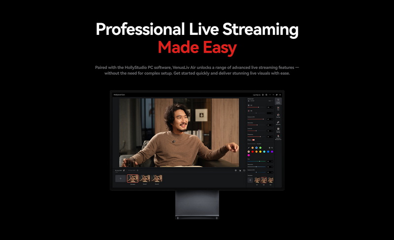 มาพร้อมแอปและซอฟต์แวร์เสริม: VenusCam (Mobile App) สำหรับควบคุมกล้องผ่านสมาร์ทโฟน และ Hollyland CAM (PC Software) สำหรับตัดต่อ ใส่ Green Screen, Overlay และ Beauty Filter