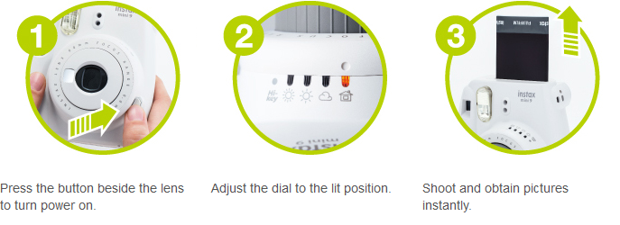 instax mini 9 automatically determines the best brightness for taking a picture, and informs you of the suitable setting by lighting the corresponding lamp.Turn the brightness adjustment dial to the position (mark) of the lit lamp.