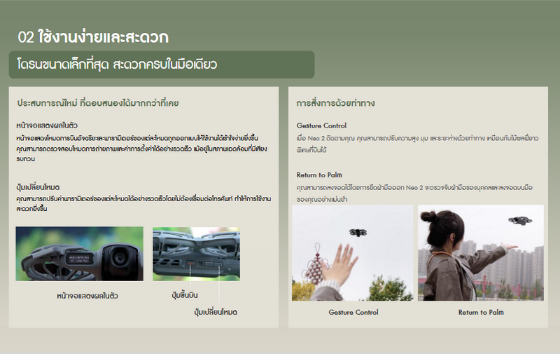 Neo 2 ขึ้น-ลงจากฝ่ามือได้ (Palm Takeoff & Landing) และมี Return-to-Palm ให้โดรนบินกลับมาจอดบนฝ่ามืออย่างแม่นยำ ควบคุมทิศทางและระยะด้วย Gesture Control ได้โดยไม่ต้องใช้รีโมต หรือจะสั่งงานด้วยเสียงผ่านสมาร์ตโฟน/หูฟังบลูทูธก็ได้ (รองรับภาษาอังกฤษ/จีน) ต้องการภาพมืออาชีพยิ่งขึ้น จับคู่กับรีโมต DJI RC-N3 เพื่อควบคุมแบบดั้งเดิมระยะไกลสูงสุด 10 กม. หรือใส่แว่นตา DJI Goggles พร้อม Motion Controller เพื่อบินแบบ FPV ที่เร้าใจ