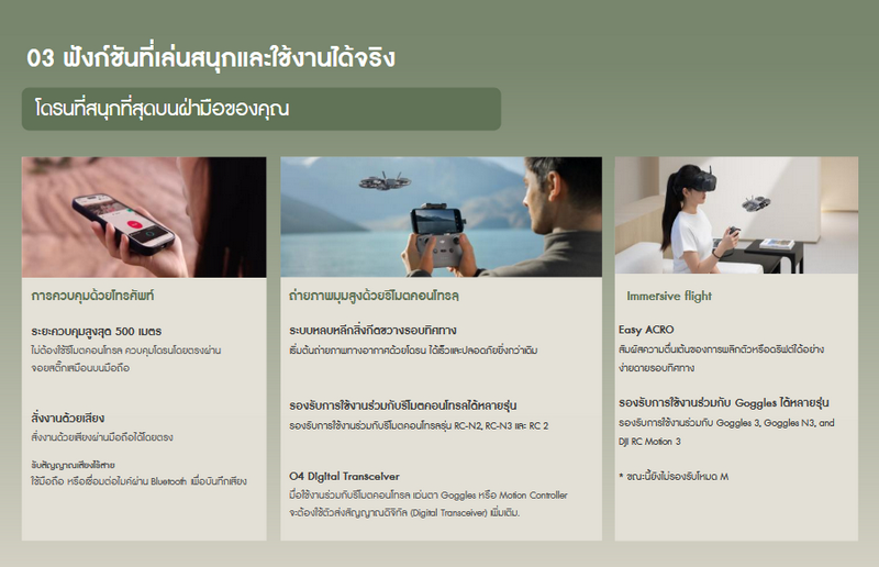 บินได้นานสูงสุด 19 นาที ต้านลมคงที่ได้ถึง ~10.7 ม./วินาที เมื่อใช้รีโมต O4 วิดีโอทรานส์มิตสูงสุด 10 กม. หรือควบคุมผ่านมือถือได้ไกล ~500 ม. เหมาะกับการเก็บฟุตเทจเที่ยว เล่นกีฬา หรือคอนเทนต์สั้นที่ต้องถ่ายซ้ำหลายเทค