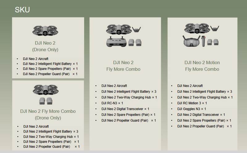 | Dimensions | 147×171×41 mm (L×W×H, with propeller guards and without DJI Neo 2 Digital Transceiver) 167×171×54 mm (L×W×H, with propeller guards and DJI Neo 2 Digital Transceiver) |
