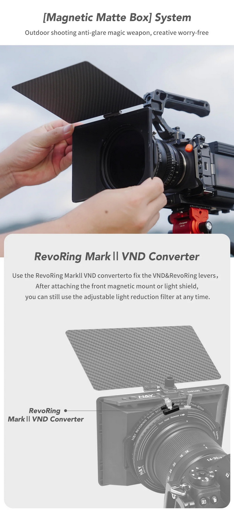 ฟิลเตอร์ VND ของ H&Y Revoring Mark II สามารถลดแสงได้ตั้งแต่ 1.5 ถึง 10 สต็อป ทำให้เหมาะกับการถ่ายกลางแจ้งหรือสภาพแสงจัด ผู้ใช้สามารถเปิดรูรับแสงกว้างหรือใช้สปีดชัตเตอร์ต่ำได้แม้ถ่ายกลางวันโดยไม่ทำให้ภาพโอเวอร์