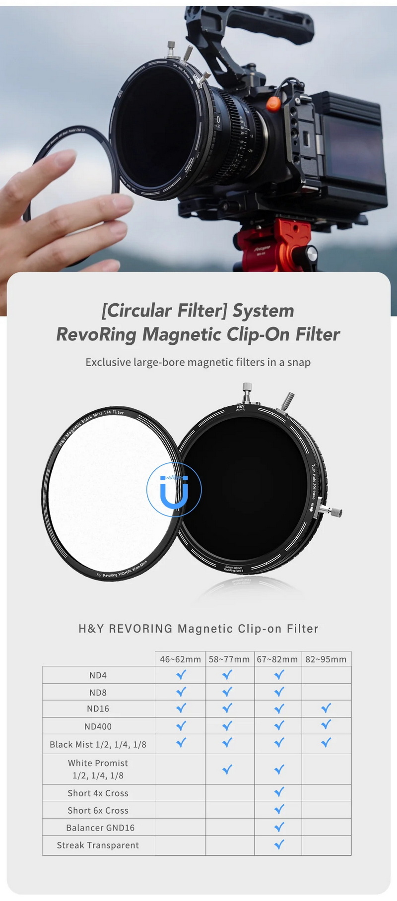 ระบบ Revoring คือเทคโนโลยีเฉพาะของ H&Y ที่ทำให้ฟิลเตอร์สามารถปรับเกลียวหน้าเลนส์ได้อัตโนมัติภายในช่วงที่รองรับ เช่น 67–82 มม. หรือ 46–62 มม. เพียงกดแล้วหมุน ฟิลเตอร์จะล็อกแน่นกับหน้าเลนส์อย่างปลอดภัย