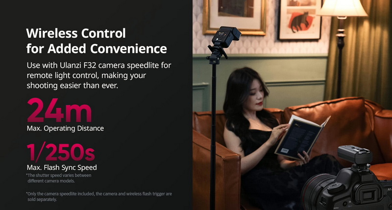 ควบคุมแฟลชไร้สายระยะไกล 24 ม. พร้อมความเร็วซิงค์สูงสุด 1/250 วินาที