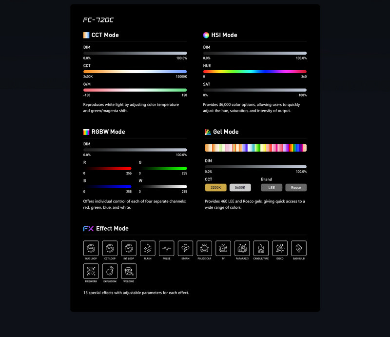 สเปค Nanlite FC720C LED RGBW Spot Light (Specification)