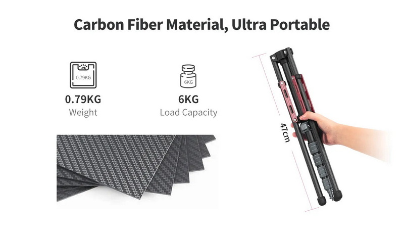 ขาตั้งผลิตจาก คาร์บอนไฟเบอร์คุณภาพสูง ทำให้มีความแข็งแรงทนทาน น้ำหนักเบาเพียง 790 กรัม แต่สามารถรับน้ำหนักอุปกรณ์ได้สูงสุดถึง 6 กิโลกรัม เหมาะสำหรับทั้งกล้องระดับโปร ไฟ LED หรืออุปกรณ์เสริมต่าง ๆ