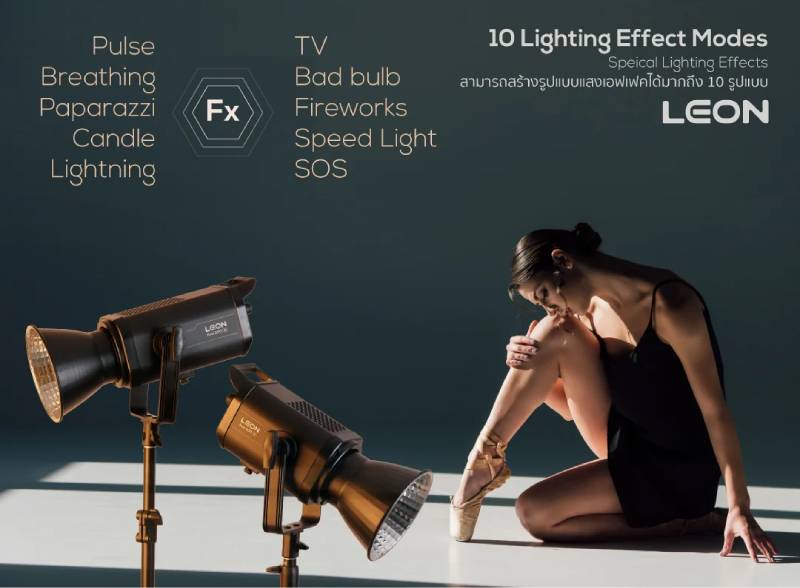 นอกจากนี้ยังมีเอฟเฟกต์แสงสำเร็จรูปถึง 10 แบบ เหมาะสำหรับงานวิดีโอสร้างสรรค์หรือการจำลองสถานการณ์แสงต่าง ๆ โดยไม่ต้องใช้อุปกรณ์เสริมเพิ่มเติม