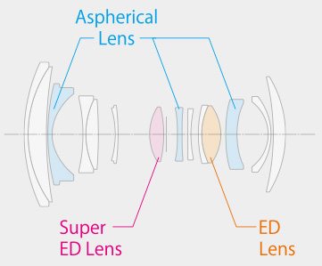 - โครงสร้างเลนส์ประกอบด้วย 14 ชิ้นใน 11 กลุ่ม รวมถึงเลนส์ aspherical 3 ชิ้น เพื่อคุณภาพภาพที่น่าทึ่งจากกลางถึงขอบเฟรม