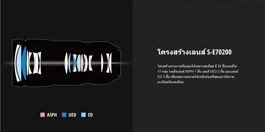 - ประกอบด้วยชิ้นเลนส์พิเศษ UED 2 ชิ้น และ ED 3 ชิ้น ช่วยลดความคลาดเคลื่อนของสีและเพิ่มความคมชัดในทุกเฟรมที่คุณถ่าย