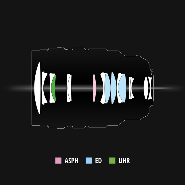 โครงสร้างเลนส์ผ่านการปรับแต่งเป็นอย่างดี เพื่อให้ลดความคลาดให้เหลือน้อยที่สุดและให้ความละเอียดที่ยอดเยี่ยมมากขึ้น โดยโครงสร้างเลนส์ประกอบด้วยเลนส์ 16 ชิ้นใน 11 กลุ่ม มีเลนส์ ASPH 1 ชิ้น เลนส์ ED 3 ชิ้น และเลนส์ UHR 1 ชิ้น
