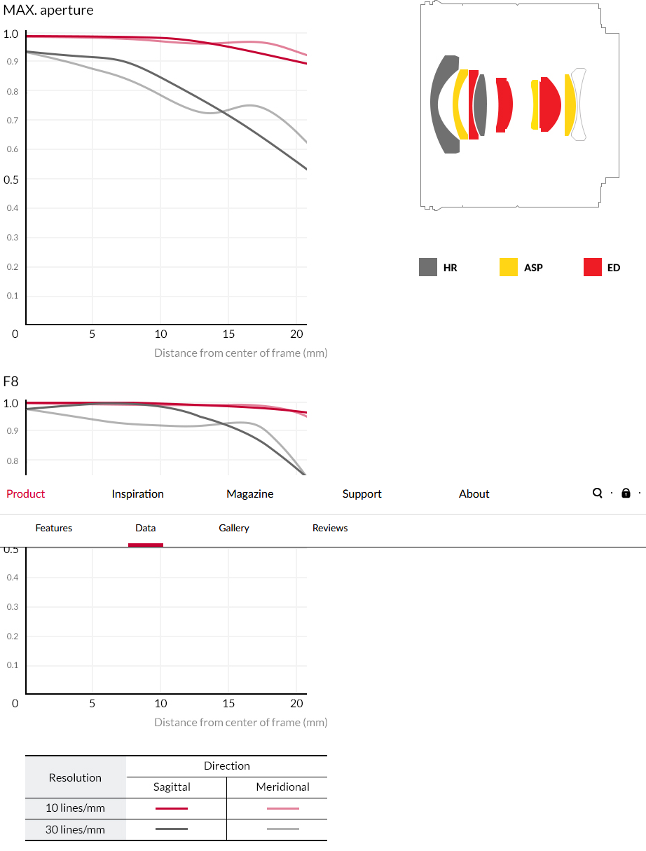 - การออกแบบเลนส์ที่มีชิ้นเลนส์พิเศษถึง 8 ชิ้น ทำให้ได้ภาพที่มีความคมชัดสูง และมีความผิดเพี้ยนของสีต่ำ เหมาะสำหรับการถ่ายภาพทิวทัศน์และ Astrophotography