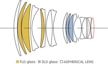 - องค์ประกอบชิ้นเลนส์พิเศษ FLD สามชิ้นเลนส์และ SLD สองชิ้นเลนส์