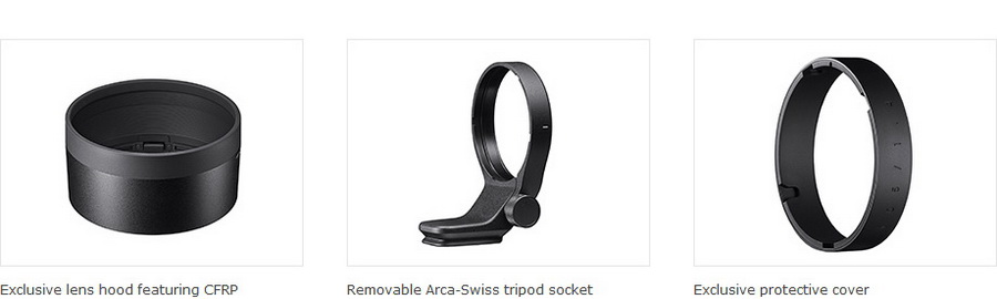 แทนที่จะทำจากพลาสติก ABS ทั่วไปเลนส์ฮูดพิเศษมี CFRP (พลาสติกเสริมใยคาร์บอน) ซึ่งเป็นวัสดุที่มีน้ำหนักเบา แต่แข็งแรงใช้ในการตกแต่งภายในและภายนอกของเครื่องบินท่ามกลางการใช้งานอื่น ๆ ช่องเสียบขาตั้งกล้อง Arca-Swiss แบบถอดได้เข้ากันได้กับแพลตฟอร์มและตัวยึด Arca-Swiss และฝาครอบป้องกันพิเศษทำให้เลนส์พกพาและใช้งานได้ง่ายขึ้นเมื่อถ่ายภาพด้วยมือถือ