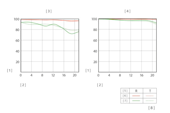 MTF (Modulation Transfer Function) อธิบายว่าเลนส์สามารถให้รายละเอียดของภาพได้ดีเพียงใด โดยวัดจากระดับความเปรียบต่างที่ได้ระหว่างเส้นที่ห่างกันอย่างเหมาะสม [1] คอนทราส (%) [2] ระยะทางจากศูนย์กลางออปติคอลของเลนส์ (มม.) [3] รูรับแสงสูงสุด [4] รูรับแสง F8 [5] ความถี่เชิงพื้นที่ [6] 10 คู่บรรทัด / มม. [7] 30 คู่บรรทัด / มม. [8] R: ค่ารัศมี T: ค่า Tangential