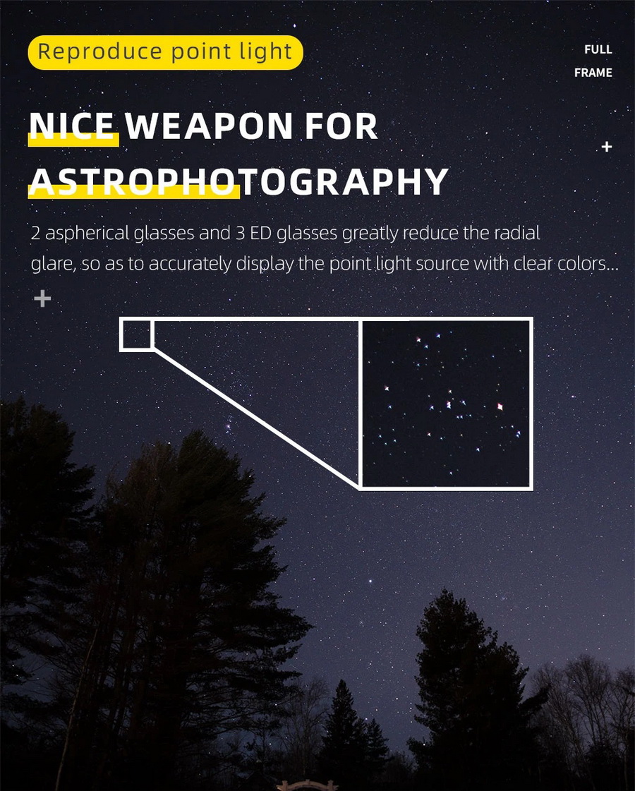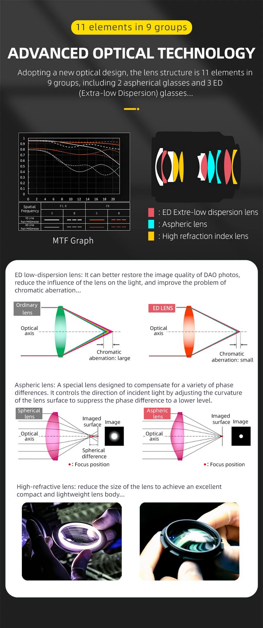 - ประกอบด้วยชิ้นเลนส์พิเศษ 2 Aspherical, 3 ED Elements และ 3 High Refractive เพื่อเพิ่มความคมชัดและลดการบิดเบี้ยวของภาพ