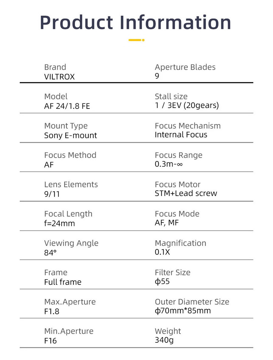จุดเด่น/เสปคย่อ Viltrox AF 24mm f/1.8 Lens