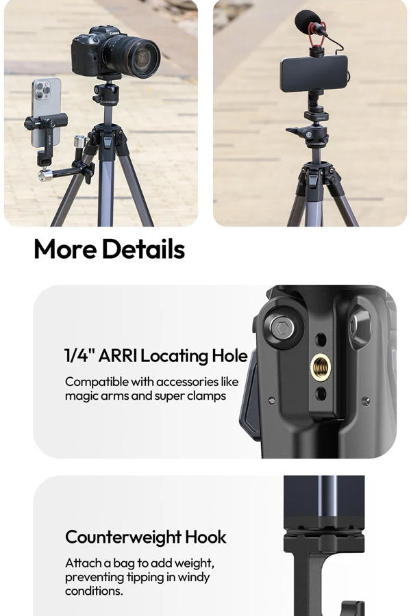 Ulanzi OMBRA II มีรูเกลียว 1/4″ ARRI Locating Hole สำหรับติดตั้ง Magic Arm หรือ Super Clamp เพิ่มอุปกรณ์เสริมได้ตามต้องการ มีตะขอแขวนถ่วงน้ำหนักเพื่อเพิ่มความมั่นคงขณะถ่ายวิดีโอหรือ Long Exposure และปลายขาที่สามารถเปลี่ยนได้ 2 แบบ รองรับทั้งพื้นผิวเรียบและพื้นผิวขรุขระ พร้อม Cold Shoe บน Phone Clamp สำหรับติดไมโครโฟนหรืออุปกรณ์เสียง