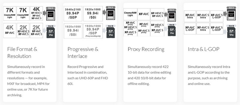 รองรับการบันทึกหลายฟอร์แมตพร้อมกัน เช่น MXF สำหรับงาน Broadcast, MP4 สำหรับออนไลน์ และ RAW สำหรับงานเก็บถาวร
