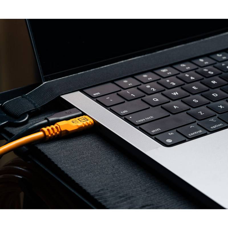 สายมาในสี ส้ม Tether Tools เอกลักษณ์ของแบรนด์ ซึ่งช่วยให้สามารถมองเห็นสายได้ชัดเจนในกองถ่ายหรือสตูดิโอ ป้องกันการเหยียบหรือสะดุด และยังดูมืออาชีพในงานเชิงพาณิชย์