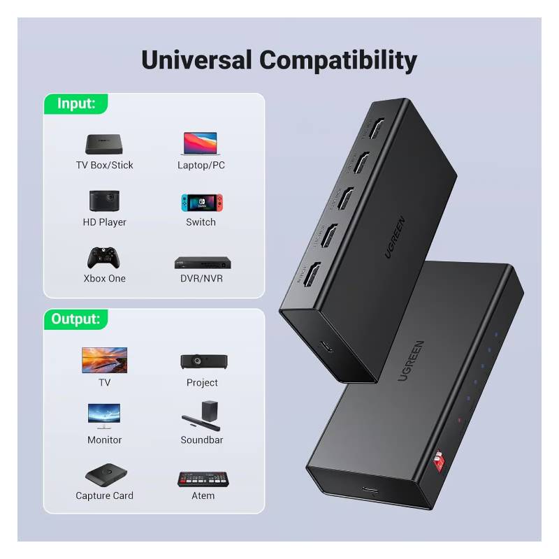สามารถเชื่อมต่อจากเครื่องเล่น Blu-ray, คอมพิวเตอร์, กล่องทีวี, กล้อง หรืออุปกรณ์อื่น ๆ ที่มีพอร์ต HDMI ไปยังทีวี โปรเจกเตอร์ หรือมอนิเตอร์ได้สูงสุด 4 เครื่องในเวลาเดียวกัน ช่วยให้การนำเสนอหรืองานแสดงผลสะดวกและมีประสิทธิภาพ