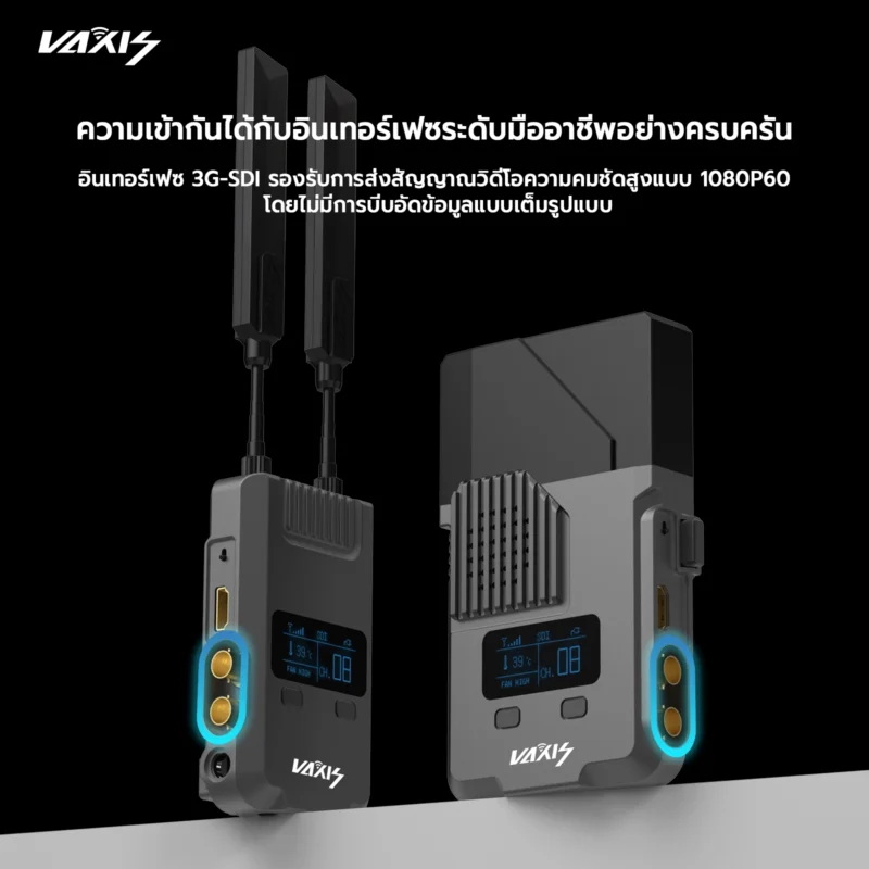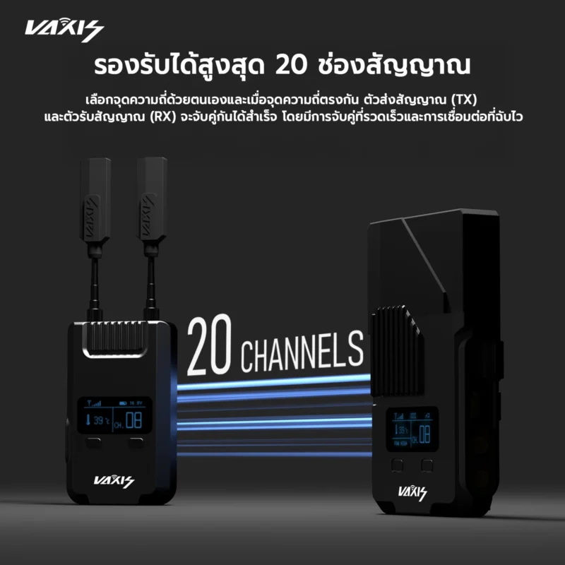 Vaxis Storm 800 Kit ชุดอุปกรณ์ส่ง–รับสัญญาณวิดีโอไร้สายระดับมืออาชีพ ที่ออกแบบมาสำหรับการถ่ายทำภาพยนตร์, โฆษณา, ไลฟ์สตรีมมิ่ง หรือโปรดักชันที่ต้องการคุณภาพภาพระดับสูงโดยปราศจากความล่าช้าในการส่งสัญญาณ ประกอบด้วย ตัวส่งสัญญาณ (TX) และ ตัวรับสัญญาณ (RX) ที่ทำงานคู่กันเพื่อถ่ายทอดวิดีโอแบบ Full HD โดยไม่มีการบีบอัด