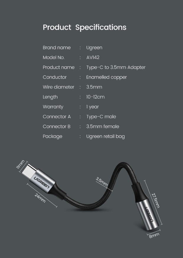 จุดเด่น/เสปคย่อ Ugreen 30632 Adapter Type C To 3.5mm Female (10cm) Headphone Jack Adapter