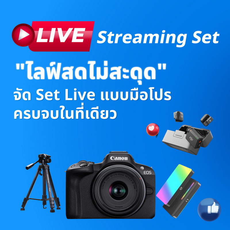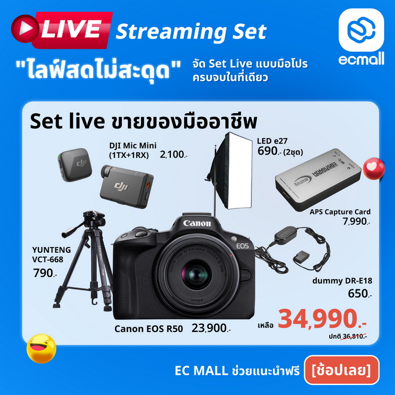 ครบทุกอุปกรณ์ที่ร้านค้าออนไลน์ต้องมี! ด้วย Canon EOS R50 กล้องคุณภาพสูงให้ภาพคมชัดสวยสด, ต่อเข้าคอมง่ายผ่าน APS Capture Card เพื่อไลฟ์บนทุกแพลตฟอร์ม, เสริมเสียงระดับมืออาชีพด้วย DJI Mic Mini (1TX+1RX), พร้อม ไฟสตูดิโอ LED e27 สองชุด ให้แสงนุ่มทั่วเฟรม, ขาตั้ง YUNTENG VCT-668 แข็งแรงมั่นคง และ Dummy DR-E18 สำหรับต่อไฟต่อเนื่องไม่ต้องกลัวแบตหมด เซ็ตนี้เหมาะสุด ๆ สำหรับพ่อค้าแม่ค้าออนไลน์ หรือครีเอเตอร์ที่ต้องการคุณภาพงานไลฟ์ระดับสตูดิโอในงบสุดคุ้ม