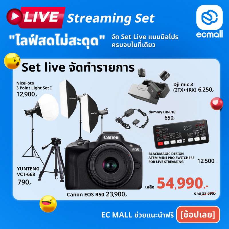 พร้อมยกระดับการผลิตรายการ ไลฟ์โชว์ หรือพอดแคสต์คุณให้ดูมืออาชีพ ด้วยอุปกรณ์คุณภาพจากแบรนด์ชั้นนำ เริ่มจาก Canon EOS R50 กล้องคุณภาพสูงให้ภาพคมชัดสีสวยระดับโปร, Blackmagic ATEM Mini Pro สลับภาพหลายกล้องได้ในคลิกเดียว, และ DJI Mic 3 (2TX+1RX) ให้เสียงชัดสองช่องในชุดเดียว เติมเต็มด้วย ไฟ NiceFoto 3 Point Light Set I แสงครบทุกมุม, ขาตั้ง YUNTENG VCT-668 แข็งแรงมั่นคง และ Dummy DR-E18 ใช้งานต่อเนื่องไม่ต้องกลัวแบตหมด เหมาะที่สุดสำหรับผู้ที่ต้องการจัดทำรายการหรือไลฟ์สตูดิโอแบบจริงจังในงบเดียวครบทุกอย่าง!